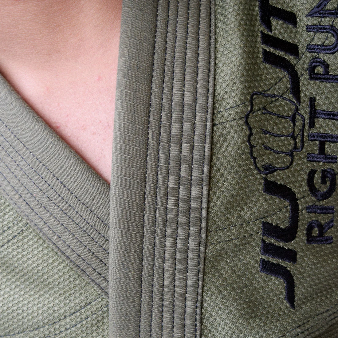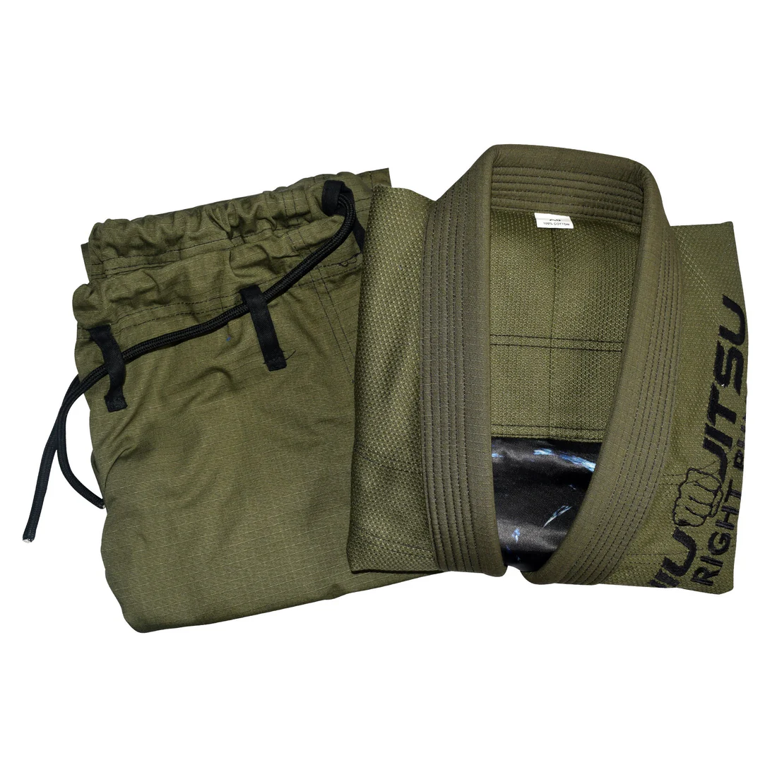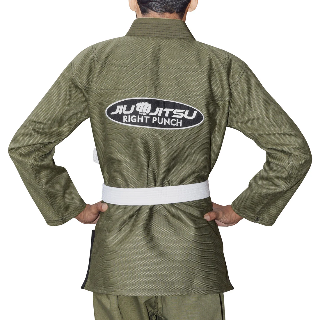 The RightPunch Olive Green BJJ Gi for Kids with Free Belt is designed to provide young martial artists with comfort, durability, and style during training and competitions. Made from high-quality, lightweight yet strong fabric, this gi ensures breathability while withstanding the rigors of Brazilian Jiu-Jitsu practice. Its reinforced stitching adds extra strength in key areas, making it durable for grappling and ground fighting. The gi comes with a free matching white belt, making it ideal for beginners starting their BJJ journey. With its clean white design and RightPunch branding, it offers both functionality and a professional look for young athletes.